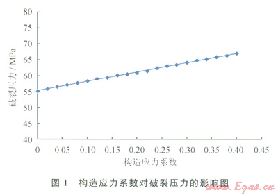 圖1是構(gòu)造應(yīng)力與破裂壓力的關(guān)系。由圖1可見(jiàn),隨著構(gòu)造應(yīng)力系數(shù)增加,破裂壓力呈線性增加。當(dāng)構(gòu)造應(yīng)力系數(shù)從0增加到0.4時(shí),破裂壓力從55MPa增加到67MPa,增幅達(dá)21.8%。元壩地區(qū)構(gòu)造處于強(qiáng)應(yīng)力作用區(qū),地層破裂壓力普遍偏高,如位于九龍山構(gòu)造帶南翼,毗鄰西北龍門(mén)山構(gòu)造帶強(qiáng)應(yīng)力區(qū)的YL2井須四段、YB6井須三段、YL6井須二段、YL10井須三段等,地層破裂壓力梯度為0.030~0.035MPa/m。其中,YL2井、YB6井在破裂壓力梯度大于0.030MPa/m下未能壓開(kāi)地層。