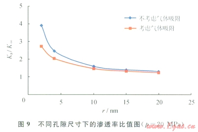 考慮氣體滑脫之后,表觀氣體滲透率可以通過(guò)式(6)計(jì)算,其中的孔隙半徑隨著壓力的變化而變化,結(jié)合式(6)、式(8),分別計(jì)算不考慮及考慮氣體吸附的表觀滲透率。圖8為直徑為10nm的納米孔隙,不同的壓力之下是否考慮氣體吸附的表觀滲透率變化曲線。圖9為壓力為20MPa時(shí),不同尺寸的納米孔隙是否考慮氣體吸附的表觀滲透率變化曲線。