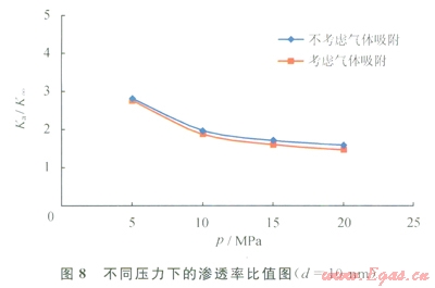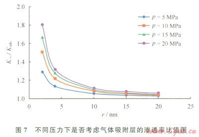 根據(jù)式(8),可以計(jì)算出不同的壓力下孔隙受到吸附層影響之后的實(shí)際有效孔隙半徑,利用有效半徑和實(shí)際半徑,再用式(9)可計(jì)算出吸附層對(duì)其滲透率的影響程度。圖7為不同的壓力和孔隙直徑下,孔隙的固有滲透率同存在吸附層時(shí)的滲透率比值,此時(shí)假設(shè)Langmuir壓力為12.5MPa,這里所計(jì)算的滲透率均為等效液體滲透率,也就是不考慮氣體滑脫效應(yīng)。