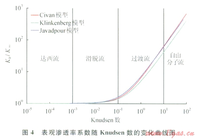 圖4為采用3種不同的模型時(shí),Ka/K∞隨著Knudsen數(shù)的變化曲線??梢钥闯觯涸陴ば粤麟A段,表觀滲透率等于絕對(duì)滲透率;在滑脫流階段,隨著Knudsen數(shù)的增大,逐漸地變大,滑脫的存在使表觀滲透率增加,3種模型在滑脫流階段的計(jì)算結(jié)果基本趨于一致;當(dāng)出現(xiàn)過(guò)渡流時(shí),3種模型的計(jì)算結(jié)果出現(xiàn)了較大的偏差,其中Civan模型和Javadpour模型結(jié)果較為接近,而Klinkenberg的模型則明顯的小于前兩者,這說(shuō)明Klinkenber模型不再適用于過(guò)渡流階段流動(dòng)規(guī)律的描述,該模型低估了過(guò)渡流階段的表觀滲透率。