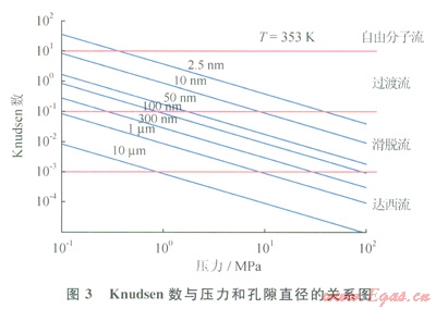 假定氣藏溫度為353K,圖3給出了不同的壓力條件下,甲烷氣在不同級(jí)別的孔隙中流動(dòng)時(shí)的Knudsen數(shù),圖3中右側(cè)給出了不同的流態(tài)的界限,可以看出:頁(yè)巖納米孔隙中的主要流態(tài)是滑脫流和過(guò)渡流。