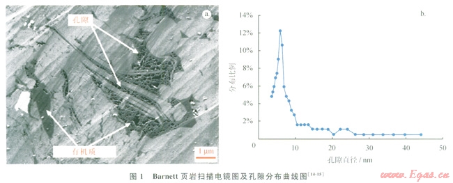 對(duì)于大部分的頁(yè)巖,其孔隙半徑比常規(guī)儲(chǔ)層要低得多,圖1-a為Barnett頁(yè)巖不同樣品的掃描電鏡圖像,可以看出,頁(yè)巖基質(zhì)主要由黏土礦物(淺灰色物質(zhì))和有機(jī)質(zhì)或干酪根組成(深灰色物質(zhì)),孔隙主要分布在有機(jī)質(zhì)中,且這些孔隙主要是納米孔隙。圖1-b所示為通過(guò)壓汞法所測(cè)得的一個(gè)Barnett頁(yè)巖的孔隙大小分布曲線,其主要孔隙半徑分布范圍在10nm以下。2010年,鄒才能等人在中國(guó)頁(yè)巖儲(chǔ)層發(fā)現(xiàn)納米級(jí)孔隙[12-13],指出頁(yè)巖氣儲(chǔ)層納米級(jí)孔隙以有機(jī)質(zhì)內(nèi)孔、顆粒內(nèi)孔及白生礦物品間孔為主,孔隙直徑范圍為5~300nm,主體為80~200nm。