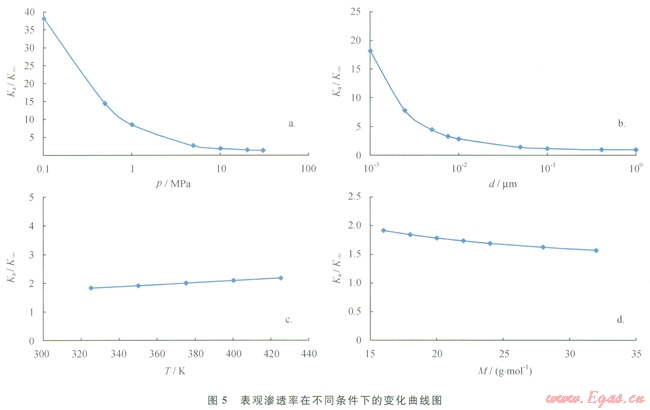 根據(jù)式(6)可知,溫度、壓力、孔隙半徑等因素均對(duì)氣體滑脫存在影響,采用Javadpour模型分析以上不同因素對(duì)頁(yè)巖納米孔隙氣體滑脫的影響程度(圖5)。圖5-a是溫度為353K的條件下,甲烷氣在10nm的孔隙中流動(dòng)時(shí),表觀滲透率隨著壓力的變化曲線;圖5-b是溫度為353K、壓力5MPa的條件下,甲烷氣在不同半徑的孔隙中流動(dòng)時(shí),表觀滲透率隨著壓力的變化曲線;圖5-c是壓力為5MPa,甲烷氣在孔隙半徑為10nm的孔隙中流動(dòng)時(shí),表觀滲透率隨著溫度的變化曲線;圖5-d為壓力為5MPa,溫度為353K,摩爾質(zhì)量不同的氣體在孔隙半徑為10nm的孔隙中流動(dòng)時(shí),靜觀滲透率隨著溫度的變化曲線。