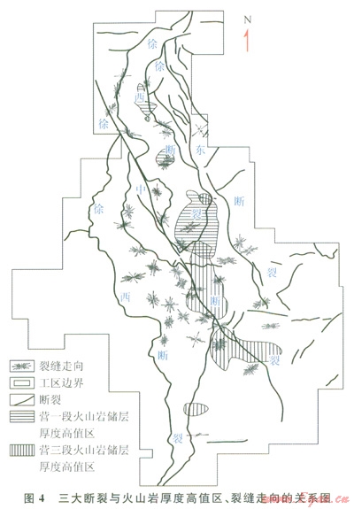 由圖4中可以看出,由徐家圍子斷陷56口井成像測井資料揭示的火山巖裂縫性儲(chǔ)層發(fā)育區(qū)主要受到三大斷裂的控制,其中徐中斷裂附近營城組火山巖中裂縫最發(fā)育,尤其是中南部,其次是徐西斷裂南段中部火山巖裂縫較發(fā)育;最少的是徐東斷裂附近火山巖,裂縫相對不發(fā)育。這主要是由于三條斷裂活動(dòng)強(qiáng)度和性質(zhì)不同造成的,徐中斷裂不僅活動(dòng)強(qiáng)烈,而且為走滑斷裂,伴隨其活動(dòng)過程,附近的營城組火山巖體內(nèi)形成大量裂縫。徐西斷裂雖然活動(dòng)也較強(qiáng)烈,但因不具走滑性質(zhì),活動(dòng)過程中在其附近形成的裂縫數(shù)量明顯少于在徐中斷裂附近的營城組火山巖體內(nèi)形成的裂縫數(shù)量。徐東斷裂活動(dòng)強(qiáng)度明顯較徐中、徐西斷裂弱,雖然其也為走滑斷裂,活動(dòng)過程中在其附近的營城組火山巖體內(nèi)形成的裂縫數(shù)量也明顯較前兩者少。