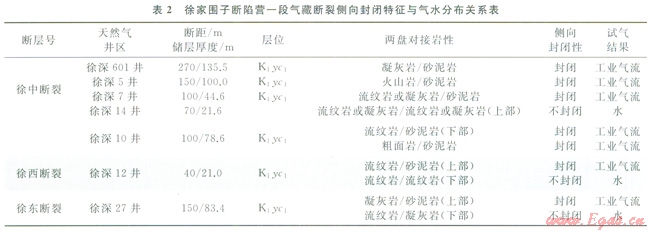 通過徐家圍子斷陷受三大斷裂遮擋的營一段氣藏現(xiàn)今斷裂側(cè)向封閉性研究結(jié)果(表2)可以看出,如果錯(cuò)斷營一段火山巖圈閉的斷裂兩盤是火山巖儲(chǔ)層與另一盤砂礫巖對接,由于砂礫巖壓實(shí)成巖程度相對較高,孔滲性差,可以對火山巖儲(chǔ)層形成側(cè)向封閉,則有利于天然氣聚集成藏,如徐中斷裂附近的徐深601井、徐深5井、徐深7井、徐深14井(上部)、徐深10井,徐西斷裂附近的徐深l2井(上部)和徐東斷裂附近的徐深27井(上部),營一段皆為火山巖儲(chǔ)層與另一盤砂礫巖對接,斷層側(cè)向上封閉,有利于天然氣聚集成藏,天然氣鉆探皆為氣層。如果斷裂兩盤是火山巖與火山巖對接;斷層側(cè)向不封閉,不利于天然氣聚集成藏,如徐中斷裂附近的徐深14井(下部),徐西斷裂附近的徐深12井(下部)和徐東斷裂的徐深27井(下部),營一段均屬于火山巖與火山巖對接,斷層側(cè)向不封閉,不利于天然氣聚集成藏,天然氣鉆探皆為水層。