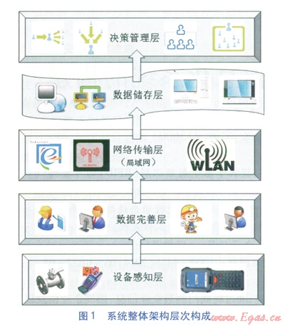 RFID可控閥門信息化系統(tǒng)整體架構(gòu)由設備感知層、數(shù)據(jù)完善層、網(wǎng)絡傳輸層、數(shù)據(jù)儲存層、決策管理層共5個層次構(gòu)成,系統(tǒng)整體架構(gòu)層次構(gòu)成見圖1。