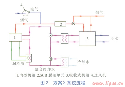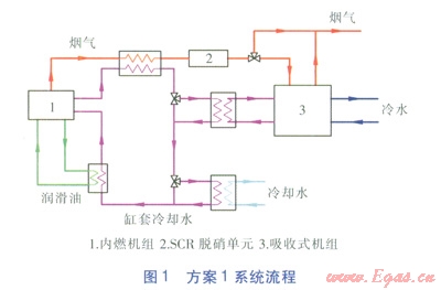 方案1系統(tǒng)流程見圖1。內(nèi)燃機(jī)組煙氣經(jīng)煙氣—水換熱器后進(jìn)入SCR脫硝單元,脫硝后進(jìn)入煙氣熱水型溴化鋰吸收式冷水機(jī)組(以下簡稱吸收式機(jī)組),放熱后與過剩煙氣一同排放。缸套冷卻水分別經(jīng)兩級(jí)換熱器降溫后,再吸收潤滑油部分熱量,最終回到內(nèi)燃機(jī)組缸套。