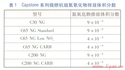 微燃機(jī)組的基本工作原理是空氣經(jīng)壓縮機(jī)增壓后與天然氣在燃燒室內(nèi)燃燒,產(chǎn)生的高溫高壓煙氣推動(dòng)透平做功帶動(dòng)發(fā)電機(jī)發(fā)電。作為最早研發(fā)也是目前最成功的微燃機(jī)組之一——Capstone系列微燃機(jī)組,集透平、高效回?zé)崞?、空氣軸承、高速永磁發(fā)電、超低排放、高度集成的數(shù)字電力轉(zhuǎn)換技術(shù)于一體。該系列微燃機(jī)組只有一個(gè)運(yùn)動(dòng)部件,結(jié)構(gòu)緊湊,采用空氣冷卻,無需潤滑油及冷卻液,運(yùn)行維護(hù)費(fèi)用低,燃料適應(yīng)性強(qiáng),可實(shí)現(xiàn)模塊化組裝,煙氣余熱具有較高的利用價(jià)值。由于采用稀薄燃燒技術(shù),使得氮氧化物排放體積分?jǐn)?shù)低于9×10-6,可滿足嚴(yán)格的環(huán)保要求,無需進(jìn)行脫硝處理。Capstone系列微燃機(jī)組氮氧化物排放體積分?jǐn)?shù)見表1。
