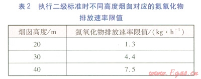 根據(jù)GB 3095—1996《環(huán)境空氣質(zhì)量標(biāo)準(zhǔn)》規(guī)定,該項(xiàng)目所在地為二類區(qū)(城鎮(zhèn)規(guī)劃中確定的居住區(qū)、商業(yè)交通居民混合區(qū)、文化區(qū)、一般工業(yè)區(qū)和農(nóng)村地區(qū)),應(yīng)執(zhí)行二級(jí)標(biāo)準(zhǔn)。根據(jù)GB 16297—1996規(guī)定,執(zhí)行二級(jí)標(biāo)準(zhǔn)時(shí)不同高度煙囪對(duì)應(yīng)的氮氧化物排放速率限值見表2。