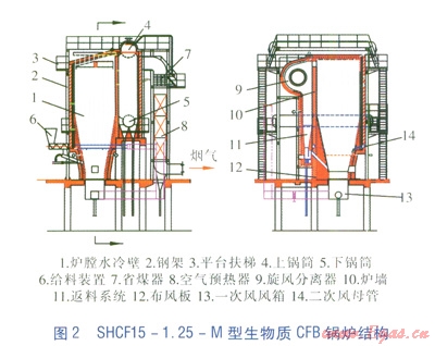 循環(huán)流化床燃燒具有傳熱性能好、燃燒效率高、有害氣體排放少、熱容量大等優(yōu)點(diǎn),很適合燃用含水量高、熱值低的生物質(zhì)燃料。SHCF15-1.25-M型生物質(zhì)CFB鍋爐結(jié)構(gòu)合理,燃燒效率及熱效率高,深受用戶好評(píng),具有廣闊的市場前景。