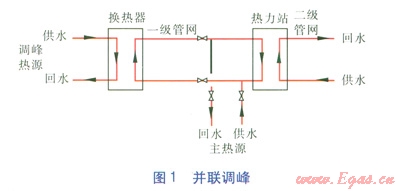 這種方式是目前國(guó)內(nèi)常見(jiàn)的調(diào)峰形式,考慮調(diào)峰熱源的相對(duì)位置及容量大小,又可細(xì)分為裂解調(diào)峰(調(diào)峰熱源與主熱源分別運(yùn)行)和并聯(lián)調(diào)峰(見(jiàn)圖1)。并聯(lián)調(diào)峰是調(diào)峰熱源高溫?zé)崴M(jìn)入換熱器與主熱源一級(jí)管網(wǎng)循環(huán)水進(jìn)行熱交換,使一級(jí)管網(wǎng)循環(huán)水升溫后輸送至各熱力站,與二級(jí)管網(wǎng)換熱。調(diào)峰熱源處于管網(wǎng)前端時(shí),適宜裂解調(diào)峰;調(diào)峰熱源處于管網(wǎng)水力工況薄弱點(diǎn)時(shí)適宜并聯(lián)調(diào)峰,在滿(mǎn)足熱負(fù)荷的前提下,能改善管網(wǎng)末端水力工況。