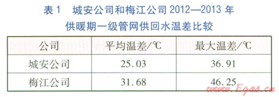 天津市城安熱電有限公司(以下簡(jiǎn)稱(chēng)城安公司)和天津市梅江供熱公司(以下簡(jiǎn)稱(chēng)梅江公司)2012—2013年供暖期一級(jí)管網(wǎng)供回水溫差比較見(jiàn)表1。由表1可知,城安公司一級(jí)管網(wǎng)供回水溫差與梅江公司差距較大。
