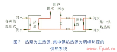 當(dāng)今,多熱源熱泵技術(shù)日臻成熟,太陽(yáng)能、風(fēng)能、污水、土壤等眾多熱源均可作為低品質(zhì)熱源,通過(guò)熱泵轉(zhuǎn)換為高品質(zhì)熱源供熱。因此,在天津市能源集團(tuán)“全市一網(wǎng)”戰(zhàn)略部署中,設(shè)置大型熱泵能源站,以熱泵為主熱源承擔(dān)廣大熱用戶(hù)的基本負(fù)荷,以集中供熱的熱水為調(diào)峰熱源,在尖峰時(shí)段加熱熱泵低溫?zé)崴?,充分利用熱泵能源的同時(shí),也大大減小了集中供熱的一級(jí)管網(wǎng)流量,為實(shí)現(xiàn)集中供熱大規(guī)模化、更多地?fù)屨脊崾袌?chǎng)份額起到了至關(guān)重要的作用。熱泵為主熱源、集中供熱熱源為調(diào)峰熱源的供熱系統(tǒng)見(jiàn)圖2。