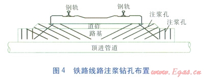 ③鉆孔:密切觀察鉆進尺度及溢水出水情況,出現(xiàn)涌水時,立即停鉆,先行注漿止水,再分析原因。確認止水效果后,方可繼續(xù)鉆孔。鐵路線路注漿鉆孔布置見圖4。
