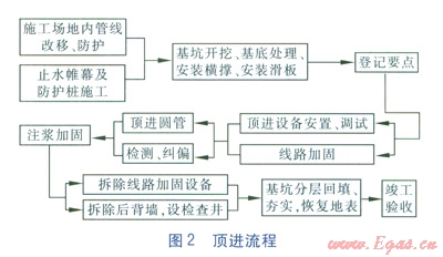 本工程開工后首先應進行施工場地內管線改移、防護,進行止水帷幕及防護樁施工。本工程屬于深基坑工程,為保證施工過程中基坑(包括頂進工作坑和接收工作坑)的安全,必須確保防護樁的施工質量。基坑防護樁完成后,進行基坑開挖、基底處理、安裝橫撐、安裝滑板。在基坑工程完成后,頂進施工前必須取得鐵路、市政、河道管理部門的同意,頂進施工前應到鐵路管理部門登記要點。登記要點后進行頂進設備的安裝調試和鐵路線路加固,然后開始頂進施工。為保證頂進方向的正確,在頂進圓管的同時進行檢測、糾偏,使頂進始終沿著正確的方向和高度進行。頂進就位后要在圓管與土體之間進行注漿加固,防止過大的沉降。待線路穩(wěn)定后拆除線路加固設備,同步拆除后背墻,設檢查井。經驗收合格后對基坑分層回填、夯實,恢復地表。最后進行竣工驗收。頂進流程見圖2。