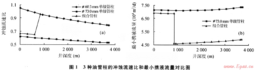 對Ø73.0mm單級油管柱、Ø60.3mm單級油管柱和Ø73.0mm×850m+Ø60.3mm×2880m兩級油管柱分別進行計算沖蝕流速比,計算結果見圖1。