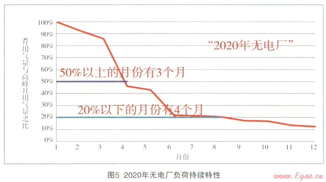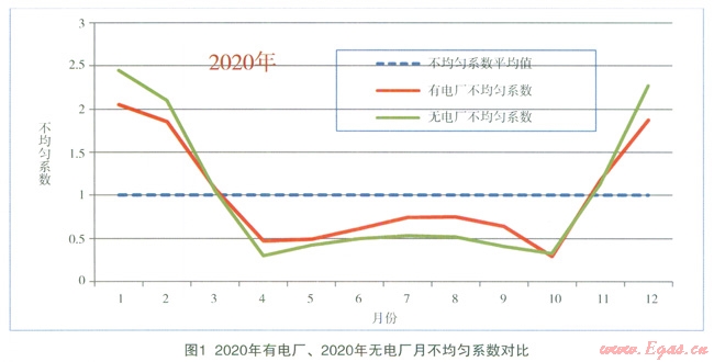 計算表明:預計到2020年,“有電廠”的最大月不均勻系數(shù)為2.05,“無電廠”為2.45,“有電廠”的最大月不均勻系數(shù)最小,“峰值”與“均值”的偏離程度最小,如圖1所示。