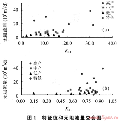 利用測井綜合特征參數(shù)及其交繪圖技術(shù),可以對儲層和干層進行快速的分類或識別。儲層和干層特征值差別較大,在干層中,特征值K2、K3、K4、K5、K9-1、K10、K11、K13均為低值,受巖性及物性的影響K6值較高。