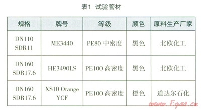 為了驗證不同等級及有無炭黑聚乙烯燃氣管材的吸水程度、對接焊麻點出現程度及其影響大小,該試驗分別選取了中密度聚乙烯原材料ME3440(含炭黑)、高密度聚乙烯原材料HE3490LS(含炭黑)及橙色高密度聚乙烯原材料XSl0 Orange YCF(不含炭黑)生產出的管材(詳見表1);為保證水份充分滲透,將管材浸泡在常溫水中,浸泡時間為2年。