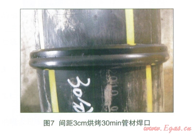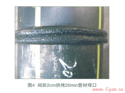 烘烤溫度要求能烘出管材端面所含水分但不能過高導致管材端面熔融無法焊接。水的沸騰汽化溫度是100%,聚乙烯管材的熔融溫度是190℃,ME3440,PE80,中密度聚乙烯管材的焊接溫度(加熱板的溫度)為200%~220%,管材斷面到熱板吸熱面對距離為2cm~3cm的烘烤溫度適宜。烘烤時間不能超過聚乙烯管材的氧化時間,ME3440,PE80,巾密度聚乙烯燃氣管材的210℃氧化誘導時間為40min左右,取烘烤時間為20min、30min來進行試驗驗證,焊接中加熱板溫度為最低焊接溫度210℃,焊接效果見圖4、圖5。