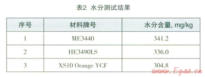 測試結果表明:3種材料聚乙烯燃氣管材均具有吸水性,并且水分含量相差不大,均大于300mg/kg。