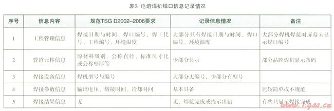 在焊口信息記錄方面,各品牌電熔焊機(jī)都具有數(shù)據(jù)檢索存儲(chǔ)功能,配置相應(yīng)的輸出接口(數(shù)據(jù)下載或打印接口),存儲(chǔ)容量高于標(biāo)準(zhǔn)和規(guī)范要求(不少于250個(gè))。但是,與全自動(dòng)熱熔焊機(jī)一樣存在信息不規(guī)范或不全的問(wèn)題。對(duì)于具有可追溯性的焊口信息來(lái)說(shuō),應(yīng)至少包括工程管理、管道元件信息、焊接設(shè)備信息、焊接參數(shù)信息和焊接結(jié)果信息等5個(gè)方面。如表3所示,不少焊機(jī)記錄的焊口信息過(guò)于簡(jiǎn)單和不規(guī)范。這既與目前相關(guān)標(biāo)準(zhǔn)和規(guī)范對(duì)此要求不夠具體有關(guān),又與對(duì)焊口信息對(duì)焊接工程管理重要性認(rèn)識(shí)不足有關(guān)。