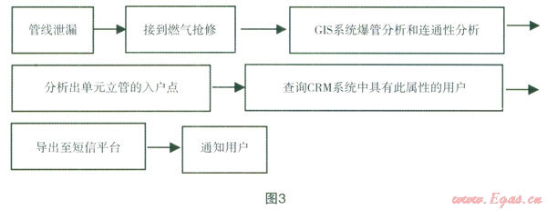 在GIS系統(tǒng)中,設置單元立管的入戶點為最小單元;在CRM系統(tǒng)中,增加燃氣用戶所屬單元立管入戶點的屬性;當出現(xiàn)燃氣管道泄漏搶修問題時,可以通過GIS系統(tǒng)中的爆管分析和連通性分析,分析出泄漏點所影響的單元立管入戶點,通過調用CRM系統(tǒng)中的具有此入戶點屬性的用戶,分析出所影響的用戶數(shù),并調用短信平臺接口將停氣通知實時發(fā)送至用戶手機中。此種方式,提高了影響范圍用戶的準確性,并縮短了通知用戶的時間。具體的過程如圖3。