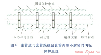 ③不可避免加設(shè)套管時(shí),套管兩端可不必密封防水材料,只要在主管道與套管之間充填柔軟材料防止沙石進(jìn)入對(duì)防腐層起破壞作用即可。因?yàn)楫?dāng)套管內(nèi)有水或泥土存在時(shí),能起到導(dǎo)電介質(zhì)的作用,陰極保護(hù)電流通過(guò)介質(zhì)形成回路,不會(huì)被屏蔽。套管可視為土壤介質(zhì)的一部分,陰極保護(hù)電流從套管外壁流入,從套管內(nèi)壁流出,再?gòu)闹鞴艿劳獠苛魅?,主管道將受到很好的陰極保護(hù)[2]。如果套管與主管道間有特定性能的電解質(zhì)物質(zhì),導(dǎo)電性能會(huì)更好,主管道陰極保護(hù)的效果會(huì)更好,其原理見(jiàn)圖4。