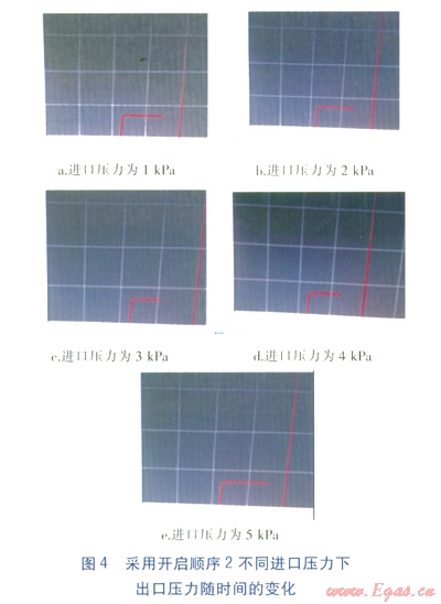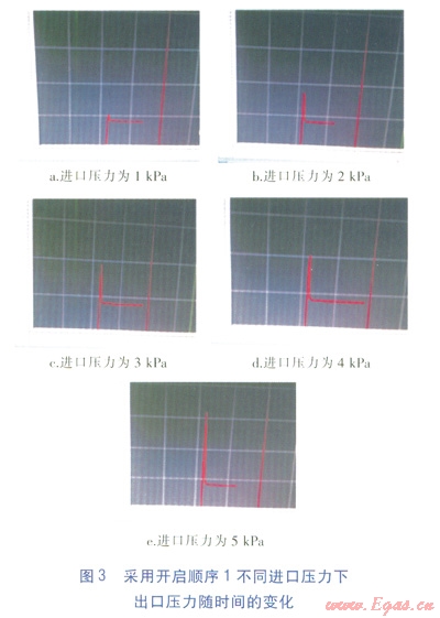 在不同進(jìn)氣壓力p1(1、2、3、4、5kPa)下進(jìn)行試驗(yàn),并記錄出口壓力p2的變化情況,見圖4,橫坐標(biāo)表示時(shí)間,縱坐標(biāo)表示p2。由圖4可知,采用開啟順序2時(shí),出口壓力p2比較穩(wěn)定,隨著進(jìn)口壓力p1升高,出口壓力p2仍然比較穩(wěn)定,沒有出現(xiàn)過沖現(xiàn)象。