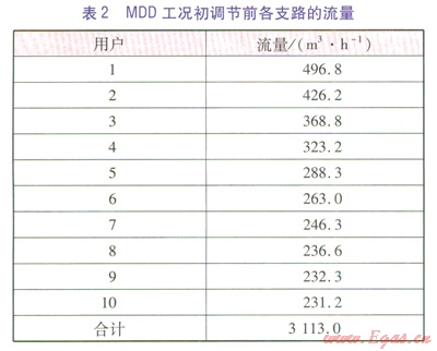 MDD工況初調(diào)節(jié)前各支路的流量見表2。MDD工況下,初調(diào)節(jié)前管網(wǎng)總流量為3113m3/h.遠遠超出設(shè)計流量(1000m3/h),近端用戶的水力失調(diào)度為4.97,出現(xiàn)嚴重的水力失調(diào),這樣長時間運行下去,不僅管網(wǎng)壓力很高,而且水泵超負荷運行,造成能源的極大浪費。