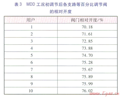 初調(diào)節(jié)后供回水壓力曲線比較平緩,說明各用戶資用壓頭平穩(wěn)下降,運行條件得到了很大的改善。同時,各用戶流量均達到了設(shè)計流量。此時,管網(wǎng)用戶支路上等百分比調(diào)節(jié)閥的相對開度見表3。