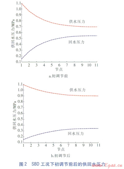 通過計算整個管網(wǎng)最不利熱用戶的壓力降,選擇水泵的壓頭為938.99kPa。利用Matlab軟件編程實現(xiàn)整個管網(wǎng)的運行調(diào)節(jié)。SBD工況下初調(diào)節(jié)前、后的供回水壓力見圖2。