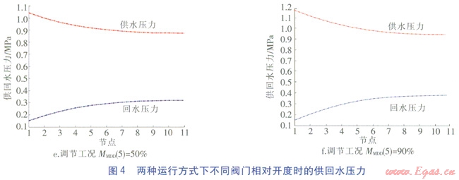 以用戶5所在支路上的閥門調(diào)節(jié)為例,對閥門相對開度為50%、90%及74.7%(設(shè)計工況下的閥門相對開度)的水力工況進行分析比較。SBD工況的閥門相對開度用MSBD表示,MDD工況的閥門相對開度用MMDD表示。兩種運行方式下不同閥門相對開度時的供回水壓力見圖4。