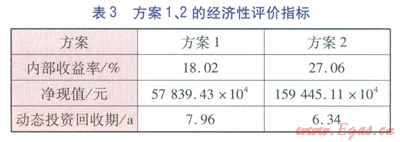 本文采用內(nèi)部收益率(稅前)、凈現(xiàn)值(稅前)、動態(tài)投資回收期(稅前)作為方案經(jīng)濟性評價指標。內(nèi)部收益率的經(jīng)濟含義是項目在其壽命期內(nèi)未回收資金的預計收益率,項目投入運營后,投資額將通過每年所產(chǎn)生凈效益的形式逐步得到回收。已回收部分將用于再投資,未回收部分待繼續(xù)回收,內(nèi)部收益率就是指未回收部分的收益率,因此稱為內(nèi)部收益率。凈現(xiàn)值的經(jīng)濟含義是項目在其壽命期內(nèi)預計創(chuàng)造的全部凈效益。內(nèi)部收益率、凈現(xiàn)值都是反映項目贏利能力的指標,前者體現(xiàn)的是相對贏利能力,后者體現(xiàn)的是絕對贏利能力。內(nèi)部收益率、凈現(xiàn)值越大,項目贏利能力越強。動態(tài)回收期越短,說明項目收回投資額的時間越短。方案1、2的經(jīng)濟性評價指標見表3。由表3可知,方案2的內(nèi)部收益率、凈現(xiàn)值均高于方案l,且方案2的動態(tài)投資回收期短于方案l,這說明方案2的經(jīng)濟性優(yōu)于方案l。