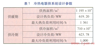 對于供冷對象,考慮到居住建筑同時利用率低、運行管理及收費復雜等情況,該冷熱電聯(lián)供系統(tǒng)的供冷對象主要考慮辦公、商場等公共建筑,不考慮居住建筑。供熱對象涉及居住建筑及公共建筑,居住建筑供熱面積為627×104m2,公共建筑供熱面積為568×104m2。冷熱電聯(lián)供系統(tǒng)設(shè)計參數(shù)見表l。由表1可知,該冷熱電聯(lián)供系統(tǒng)設(shè)計冷熱負荷比較接近,這對于熱電機組的高效運行十分有利。