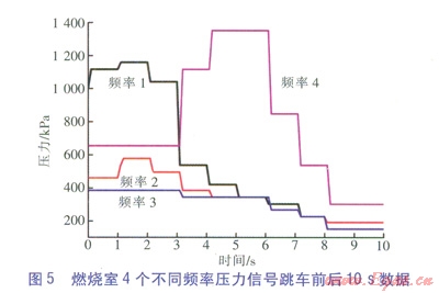 燃燒室4個不同頻率壓力信號跳車前后10s數(shù)據(jù)如圖5所示,這4個壓力信號表征燃燒室火焰振蕩特征頻段的強度。頻率l、頻率2、頻率3、頻率4代表頻率依次降低。從圖5可以看出,在2s左右,高頻段頻率1、頻率2的值突降,圖3和圖4中7號燃燒室的溫度也突然降低;3s左右,高頻段強度進一步降低,低頻段信號頻率4突然增強,7號燃燒室的溫度也再次下降;4s左右,這一趨勢進一步加強,7號燃燒室溫度也進一步降低;6s以后,所有頻段的信號強度都減弱,這是因為主、輔燃料閥都已經(jīng)關小,燃燒室功率下降。從以上變化趨勢可以看出,火焰高頻振動減弱、低頻振動加強代表燃燒不穩(wěn)定的增強,最后導致火焰被吹滅,燃燒室溫度下降。該廠現(xiàn)場操作人員也反映,燃氣輪機運行過程中除了正常的運行噪聲外,還有周期性的轟隆聲,這些外部表現(xiàn)與燃氣輪機熱聲振蕩燃燒現(xiàn)象非常相似。周期性的燃燒不穩(wěn)定,并且出現(xiàn)較大振幅的壓力波動,這種現(xiàn)象通常稱為熱聲振蕩燃燒。