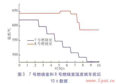 SGT-200-2S燃氣輪機有8個燃燒室,每個燃燒室都設置了測溫熱電偶,7號燃燒室和8號燃燒室跳車前后10s數(shù)據(jù)如圖3所示,其他燃燒室溫度變化情況與8號燃燒室情況類似。