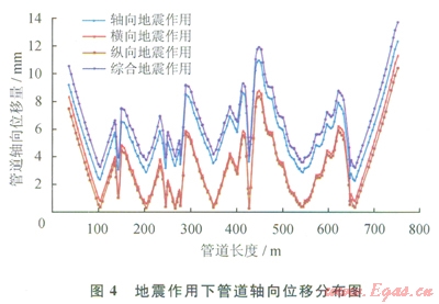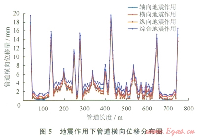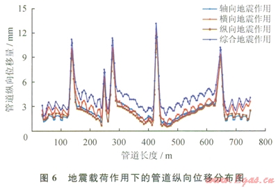 1)軸向、橫向、縱向及綜合地震作用對(duì)管道的橫向位移影響最大,且最大橫向位移明顯高于最大軸向及縱向位移,說(shuō)明輸氣管道在穿越地震帶時(shí),應(yīng)重點(diǎn)對(duì)管道的橫向位移量進(jìn)行監(jiān)測(cè)。