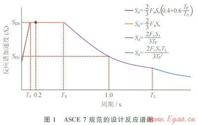 頻譜分析法中頻譜的設(shè)計(jì)與取值通常參照美國(guó)土木工程師學(xué)會(huì)ASCE 7—05《建筑物和其他結(jié)構(gòu)的最低設(shè)計(jì)載荷規(guī)范》(Minimum Design Loads for Buildings and Other Structures)[14],相對(duì)我國(guó)的GB 50011《建筑抗震設(shè)計(jì)規(guī)范》其取值較為保守[]15]。圖1為ASCE 7規(guī)范的設(shè)計(jì)反應(yīng)譜示意圖,它的周期區(qū)間分為4個(gè),不同的區(qū)間所對(duì)應(yīng)的反應(yīng)譜加速度計(jì)算公式不同(圖1中列出),其中,SDS和SD1用于選擇抗震設(shè)計(jì)類別和分析方法。