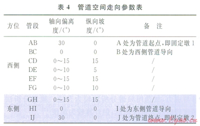 管道總長(zhǎng)度約為780m,起點(diǎn)和終點(diǎn)分別設(shè)置固定墩l、2,用以截?cái)嘌芯繉?duì)象外管道對(duì)模型的影響。西側(cè)進(jìn)土導(dǎo)向B前有30m長(zhǎng)的管段,與入土處有30°的偏離;西側(cè)水平管段長(zhǎng)約為110m,斜管總長(zhǎng)約為215m;東側(cè)出土導(dǎo)向工后有30m長(zhǎng)的管段,與出土處有30°的偏離;東側(cè)水平管段長(zhǎng)為105m,斜管長(zhǎng)約為290m。管道均采用大開(kāi)挖的敷設(shè)方式,彎管的曲率半徑(R)為6D(D為管道外徑),地區(qū)等級(jí)為l級(jí),設(shè)計(jì)系數(shù)為0.72。管道為空間結(jié)構(gòu),在X、Y、Z方向上均有長(zhǎng)度分量,其在XOY平面上的走向如圖2所示,具體空間參數(shù)如表4所示。