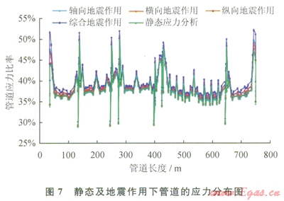 圖4~6為地震作用下管道軸向、橫向及縱向位移沿管長(zhǎng)的分布情況,圖7為靜態(tài)及地震作用下應(yīng)力沿管長(zhǎng)的分布情況,由圖4~7可以得出以下結(jié)論: