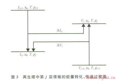 圖3表示再生塔中第j層塔板上能量的傳遞與轉(zhuǎn)換過程。現(xiàn)以其作為研究對(duì)象,對(duì)該層塔板進(jìn)行分析。