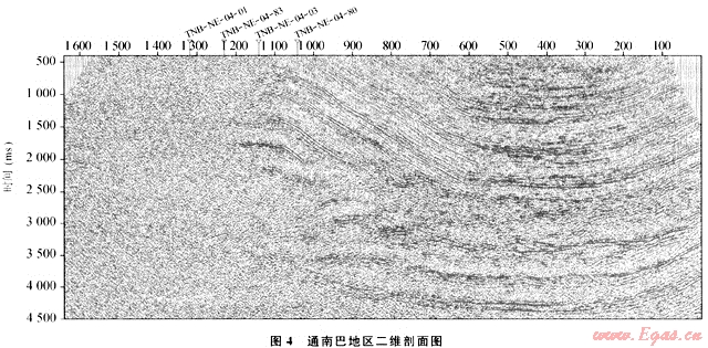 通過(guò)多年來(lái)在碳酸巖區(qū)的勘探和攻關(guān),碳酸巖區(qū)的地震資料品質(zhì)均有較大程度的提高,并且形成和發(fā)展了一系列針對(duì)碳酸巖區(qū)的地震采集技術(shù)。2006年在雪峰隆起區(qū)獲得的剖面(圖3)推覆構(gòu)造特征明顯,基底反射清晰,較好地解剖了雪峰隆起的內(nèi)部結(jié)構(gòu),對(duì)該區(qū)有了準(zhǔn)確的地質(zhì)認(rèn)識(shí);在通南巴及鎮(zhèn)巴地區(qū)開展了多次攻關(guān),獲得的剖面品質(zhì)(圖4)與老剖面相比均有較大的改善。還有在黔中隆起等多個(gè)地區(qū)的剖面也都取得了類似的滿意效果。