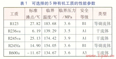 可選擇的5種有機工質(zhì)性能參數(shù)見表1。由表1可知,在5種有機工質(zhì)中,Rl23、R245fa均為等熵流體,安全等級同為B1。R123的臨界溫度較高,適用于回收較高溫度的余熱,消耗臭氧潛能值(Ozone Depression Potential,ODP)為0.0012。R245fa的臨界溫度較低,與燃?xì)鈨?nèi)燃機的余熱溫度相適應(yīng),ODP為零。綜合比較,選取R245fa作為有機朗肯循環(huán)發(fā)電系統(tǒng)的有機工質(zhì)。