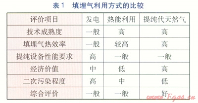 填埋氣利用方式的比較見表1。