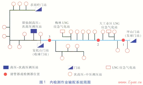 調(diào)度中心收集、匯總現(xiàn)場信息,計算分析清管器或檢測器實時速度,調(diào)整供氣門站、LNG應(yīng)急氣化站的流量,有效控制球速,滿足內(nèi)檢測作業(yè)的工藝要求。預(yù)測清管器或檢測器通過各分輸支線及收球門站的時間,提前通知廠站現(xiàn)場指揮組做好相應(yīng)操作準備。通過調(diào)整清管器或檢測器的發(fā)球時間和速度,避免在供氣高峰時段關(guān)停重要的調(diào)壓站而影響下游供氣。在清管器或檢測器卡堵的應(yīng)急情況下,進行管網(wǎng)運行工況調(diào)整及供氣保障的氣量調(diào)度。