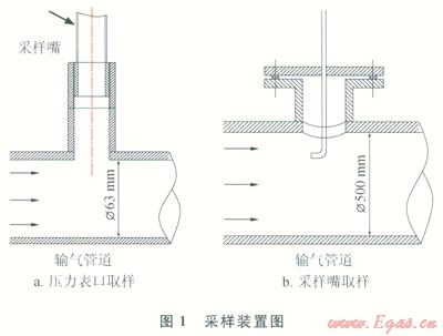井口管道的直徑為63mm,站內(nèi)匯管管徑為500mm。考慮到站內(nèi)實際情況,井口的取樣位置選擇在流量計前的短接處,更換為專門加工帶有采樣孔的短接[7];站內(nèi)匯管取樣位置首選能夠插入采樣嘴的位置,若無此類位置供選擇,就選擇壓力表口進(jìn)行取樣[8]。采樣裝置如圖1所示。