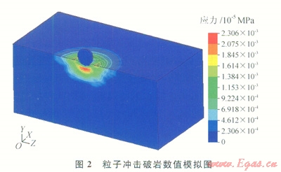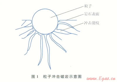 1)高速的粒子沖擊到巖石的表面后,接觸應(yīng)力繼續(xù)增加時(shí),會(huì)在接觸面附近的巖石內(nèi)部產(chǎn)生剪切應(yīng)力和拉伸應(yīng)力,當(dāng)粒子沖擊產(chǎn)生的拉應(yīng)力和剪應(yīng)力大于巖石的抗拉和抗剪強(qiáng)度后,破碎的裂紋開(kāi)始產(chǎn)生。粒子以100m/s以上的速度沖擊巖石,粒子含量為2%時(shí),粒子沖擊的頻率每分鐘達(dá)500萬(wàn)次。
