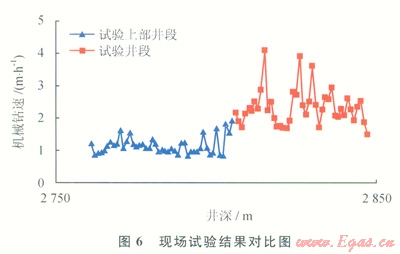 鉆井目的層為四川盆地龍崗氣田的須家河組,井眼直徑為215.9mm,直井段。試驗(yàn)井深為起始井深2843m;鉆井液密度為1.81g/cm3;泵壓為19.7MPa;排量為26L/s;鉆壓為l80~200kN;扭矩為5~5.5kN;鉆頭為Æ215.9mm加長(zhǎng)噴嘴牙輪鉆頭。