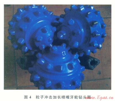 4)研制的適用于四川須家河組的粒子沖擊加長(zhǎng)平噴嘴牙輪鉆頭,通過(guò)采用加長(zhǎng)耐磨噴嘴,提高了粒子沖擊破巖的效率。